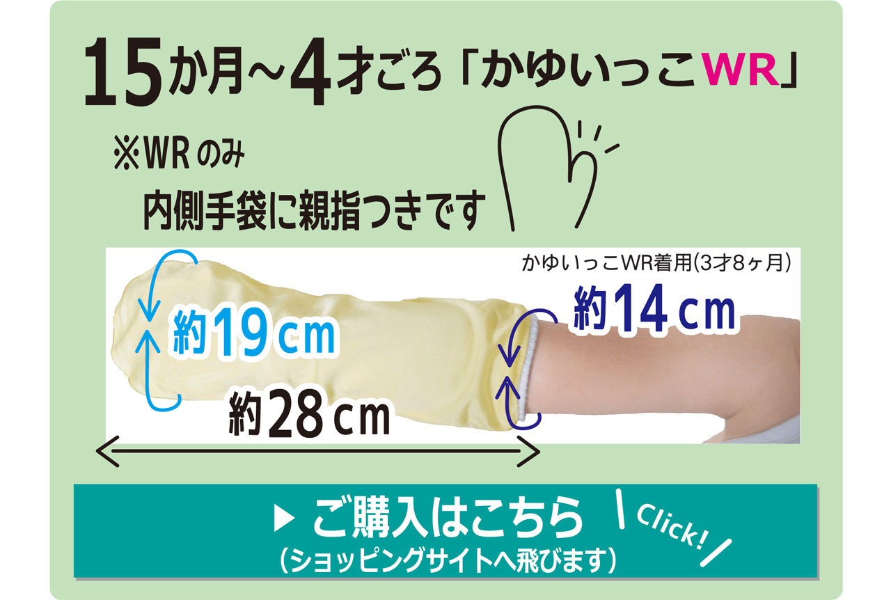 「かいちゃダメよ」から「かいても傷がつきにくい工夫」へと考えられた2枚重ねのかき傷予防ミトン